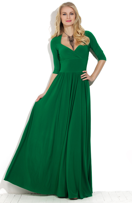 Длинное платье выполненное из трикотажа. Платье отрезное под грудью с широким поясом, подчеркивающим талию, данный элемент делает фигуру стройнее и грациознее. Лиф платья выполнен из двойного слоя трикотажа, благодаря такой обработке все внутренние швы скрыты, что придает платью богатый внешний вид. Сердцеобразный вырез декольте подходит почти для всех типов фигур, так как визуально увеличивает грудь и удлиняет шею. Рукав втачной ¾. Длинная юбка имеет сильное расклешение к низу, на линии талии густо присборена, благодаря такому крою, юбка эффектно струиться при ходьбе, что придает сексуальности и загадочности.