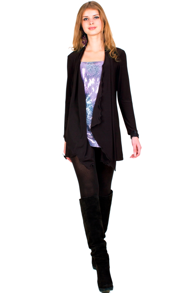 Туника-кардиган. Вставка переда сделана из блестящей ткани с пайетками, а сверху как бы наброшен кардиган из трикотажа "мамасло". Цвет вставки бледный розово-сиреневый с серебром.