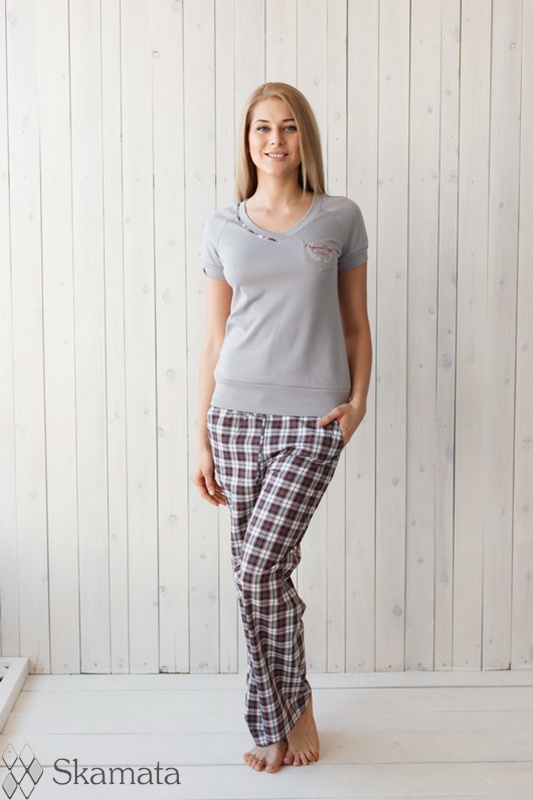 Комплект: футболка, с короткими рукавами реглан, по низу рукава манжеты, по горловине обтачка, вырез углом, вставлен кант из текстиля, накладной карман, печать, по низу изделия пояс. Брюки из текстиля, притачной пояс, в поясе тесьма эластичная, шнур. Рост 164-170