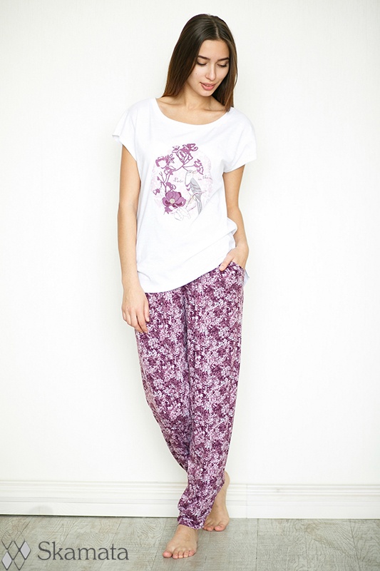Комплект, футболка со спущенным плечом, по горловине обтачка, по боковым швам разрезы, печать. Брюки, притачной пояс, в поясе тесьма эластичная, защипы, боковые карманы, по низу манжеты. Рост 164-170