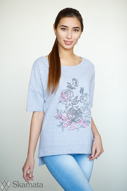 Футболка, со спущенное плечо, короткий рукав, по горловине обтачка, по низу издлия обтачка , по боковым разрезы, печать.