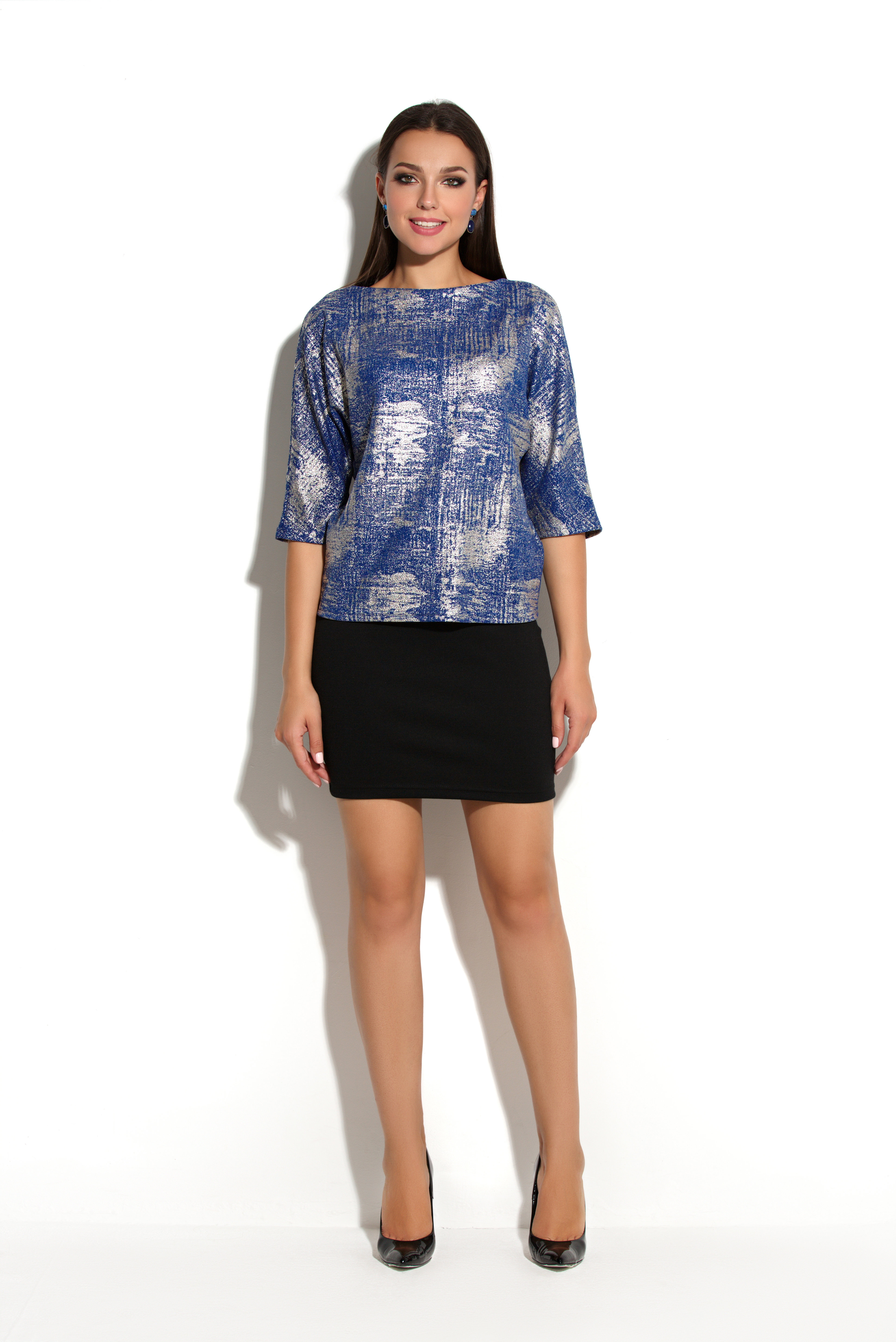 Блузка с цельнокроеным рукавом из плотного трикотажа с золотым отливом. Вырез горловины - . Рукав широкий до линии локтя. Спинка со средним швом. Силуэт блузки позволяет носить данную модель девушкам разного телосложения.