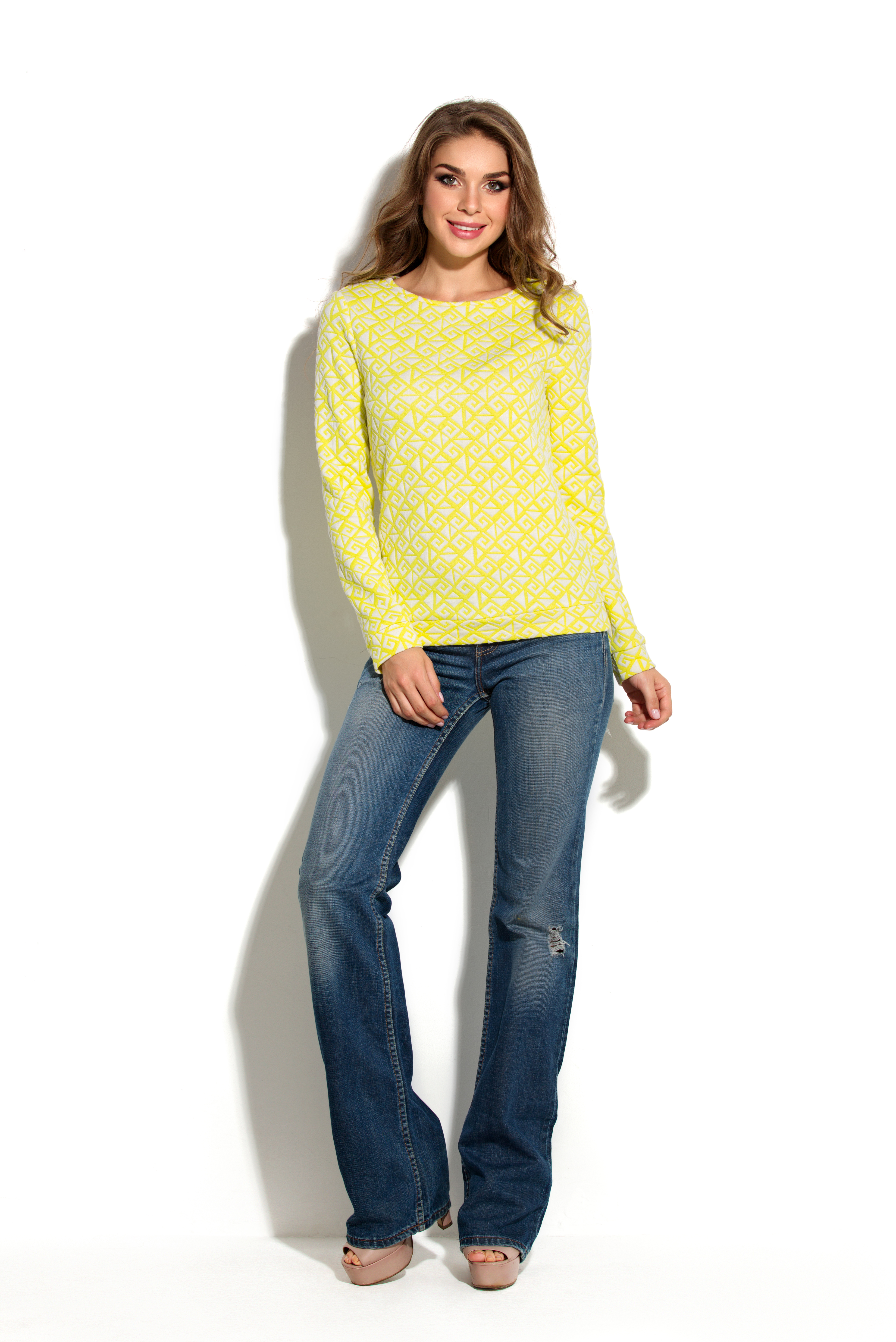Модный свитшот свободного покроя из трикотажной ткани с модным геометрическим орнаментом. Низ свитшота обработан подкроенным поясом, низ рукава -- манжетом. Рукав втачной длинный. Горловина круглая не глубокая, обработана кантом.