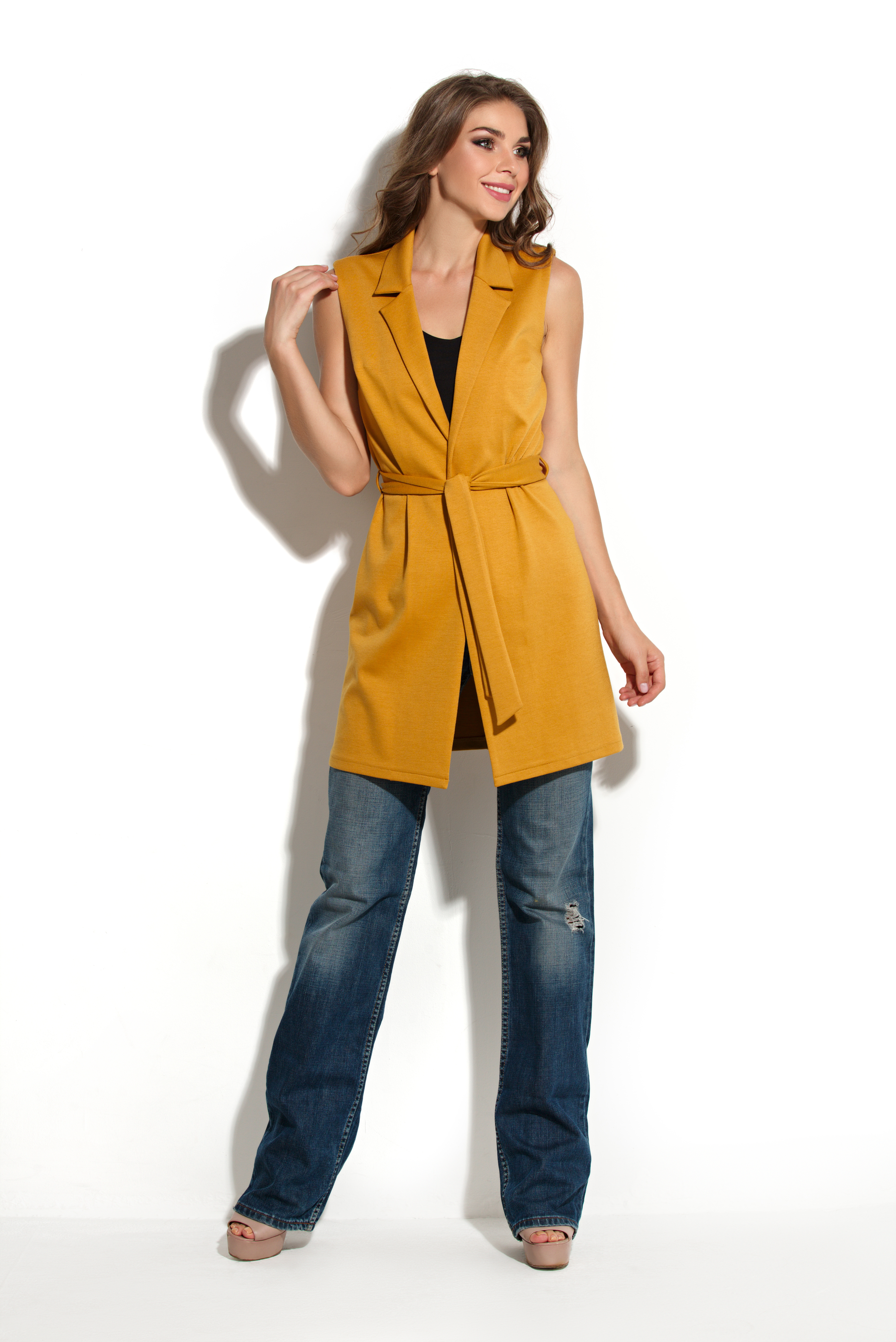 Элегантный удлиненный кардиган, выполненный из плотного трикотажа . Кардиган полуприлегающего силуэта, на полочке введены нагрудные вытачки. Спинка со средним швом. Горловина платья оформлена английским воротником. Дополняет кардиган пояс, для удобства его использования в боковых швах вшиты шлевки.