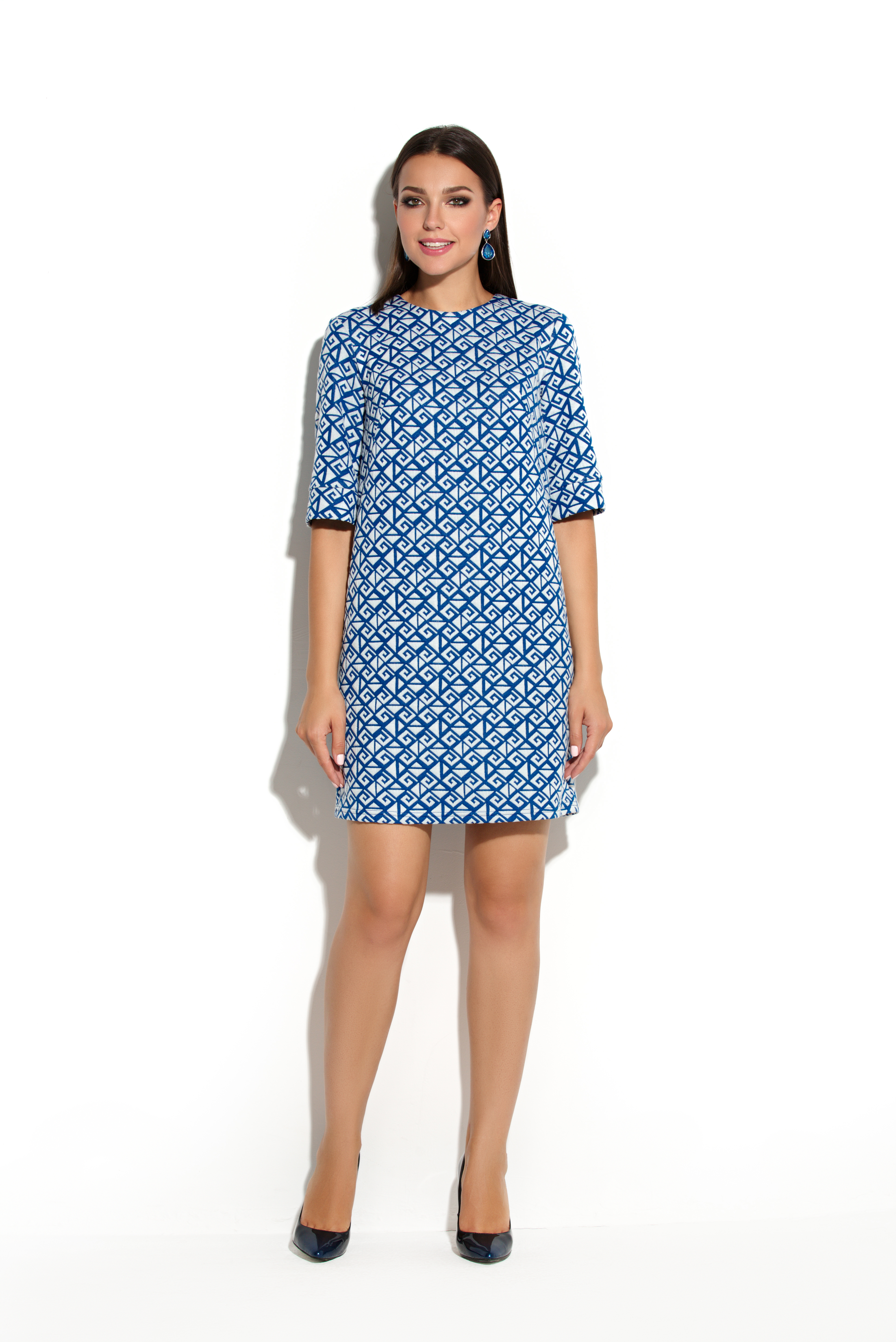 Коктейльное платье прямого силуэта из плотного фактурированного трикотажа с геометрическим рисунком. Не глубокий круглый вырез горловины обработан обтачкой. Широкий втачной рукав до локтя обработан манжетой. На полочке расположены две длинные диагональные вытачки, направленные из боковых швов. В среднем шве спинки - потайная молния. Конструктивно простое платье, выполненное из ткани с модным геометрическим орнаментом, несомненно, является трендом сезона.