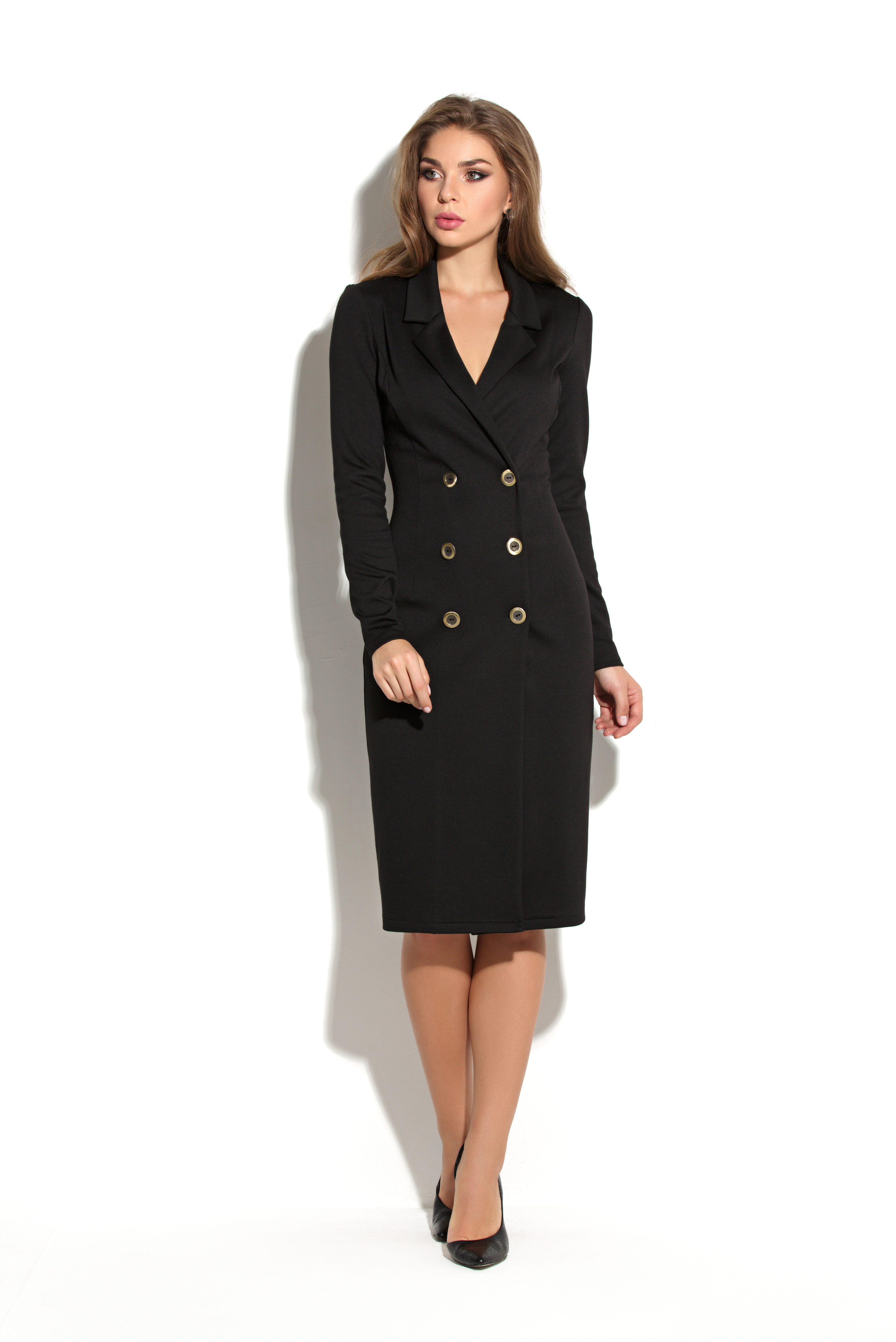 Элегантное двубортное платье-футляр. Данная модель выполнена из плотного трикотажа . На полочке и спинке введены рельефы. Спинка со средним швом и шлицей в нем. Горловина платья оформлена английским воротником. Платье двубортное с застежкой на металлические пуговицы. Рукав втачной длинный.