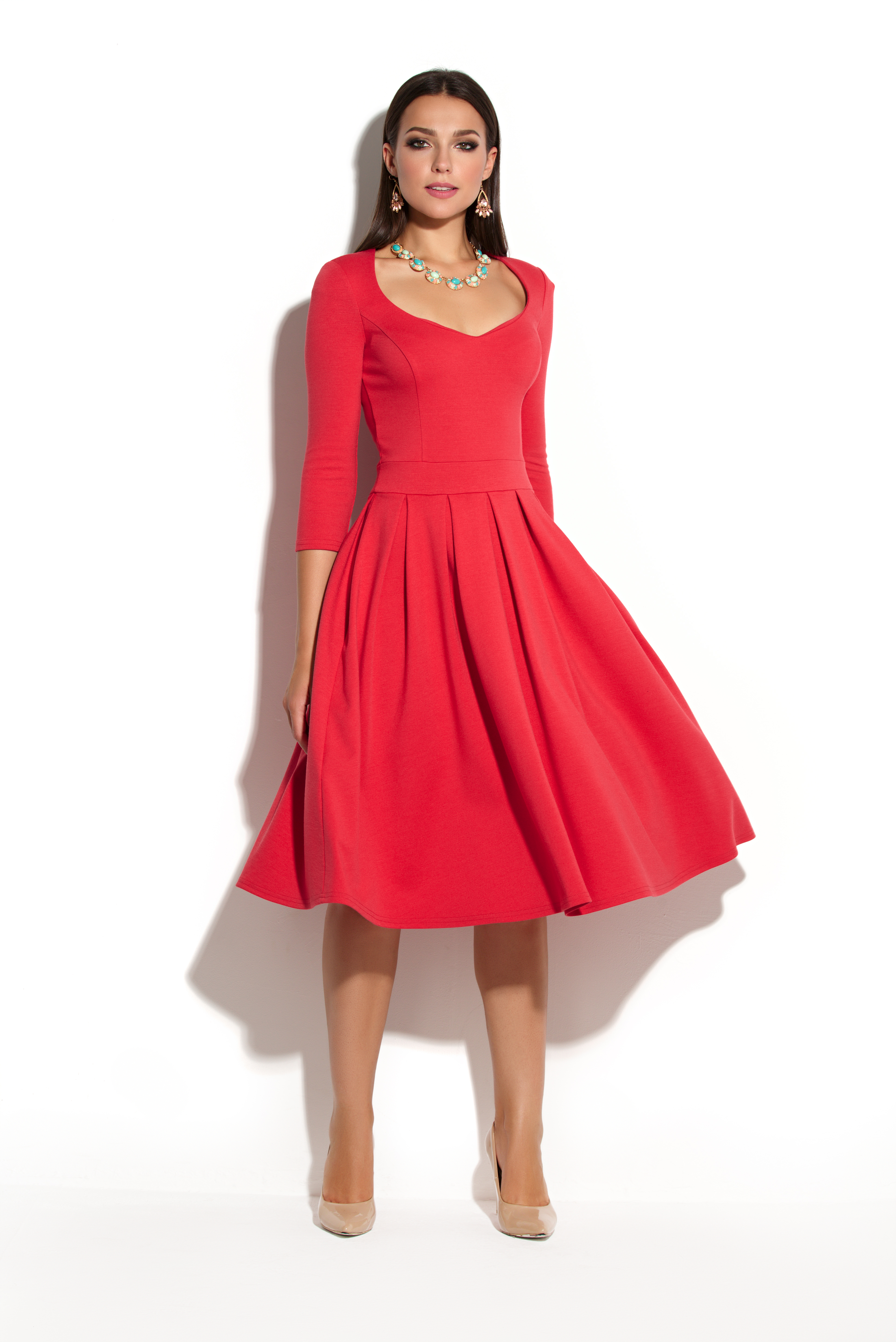 Коктейльное платье отрезное по линии талии. Силуэт лифа достигнут благодаря рельефам на полочке. По линии талии расположен отрезной пояс. Особый крой юбки с глубокими складками создает силуэт в стиле New Look, напоминающий перевернутый цветок. Вырез горловины фигурный глубокий. Рукав втачной до локтя. В среднем шве спинки застежка на потайную молнию. Силуэт платья придает женской фигуре изящности, визуально делая ее стройнее.