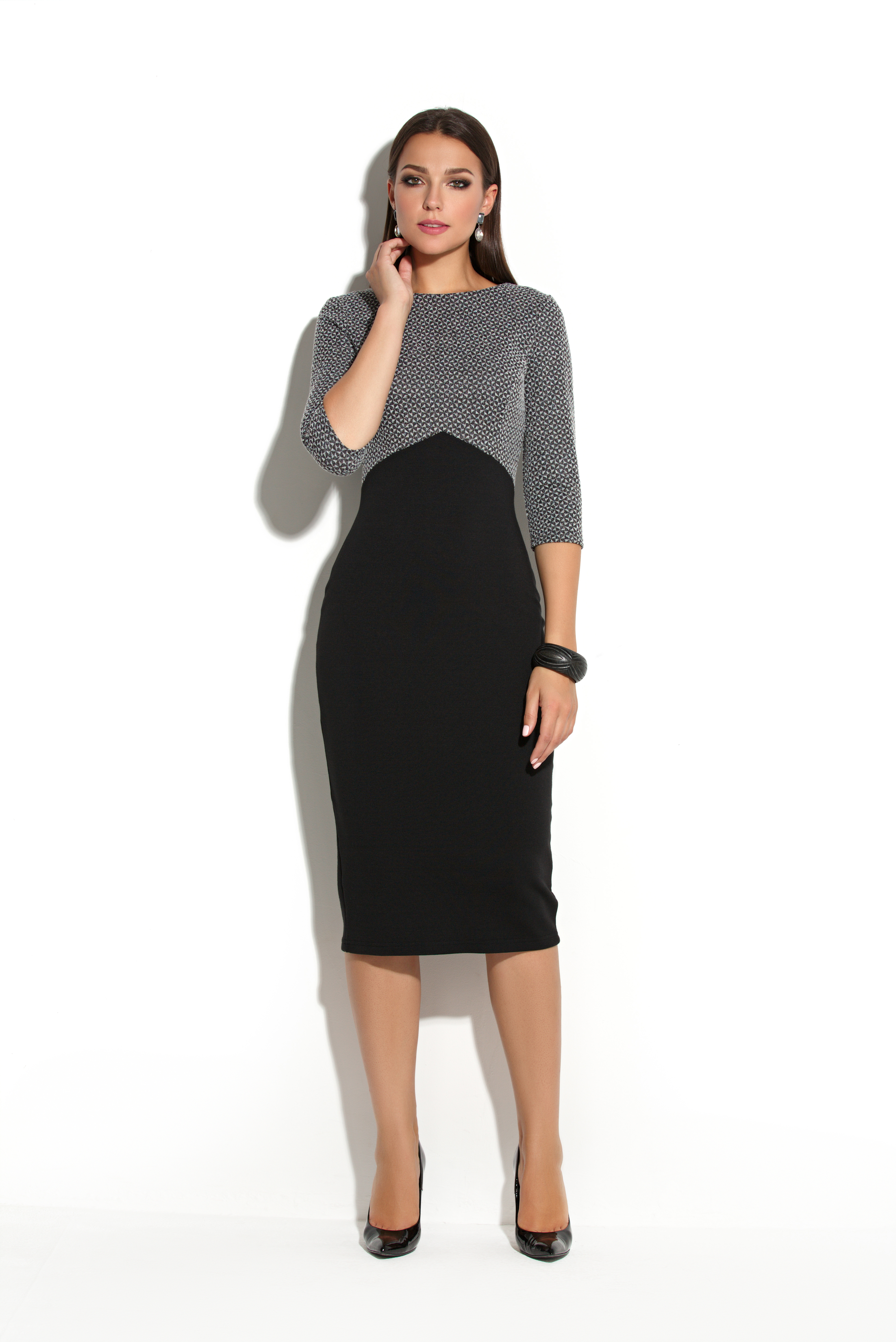 Элегантное платье-футляр прилегающего силуэта. Подрез на линии талии выполнен фигурной линией, что позволяет сделать фигуру визуально стройнее. На полочке введены рельефы. Спинка со средним швом, с застежкой на потайную молнию и шлицей в нем. Вырез горловины . Рукав втачной 3/4. Платье выполнено из тканей разного цвета и фактуры, удачно сочетающихся между собой.