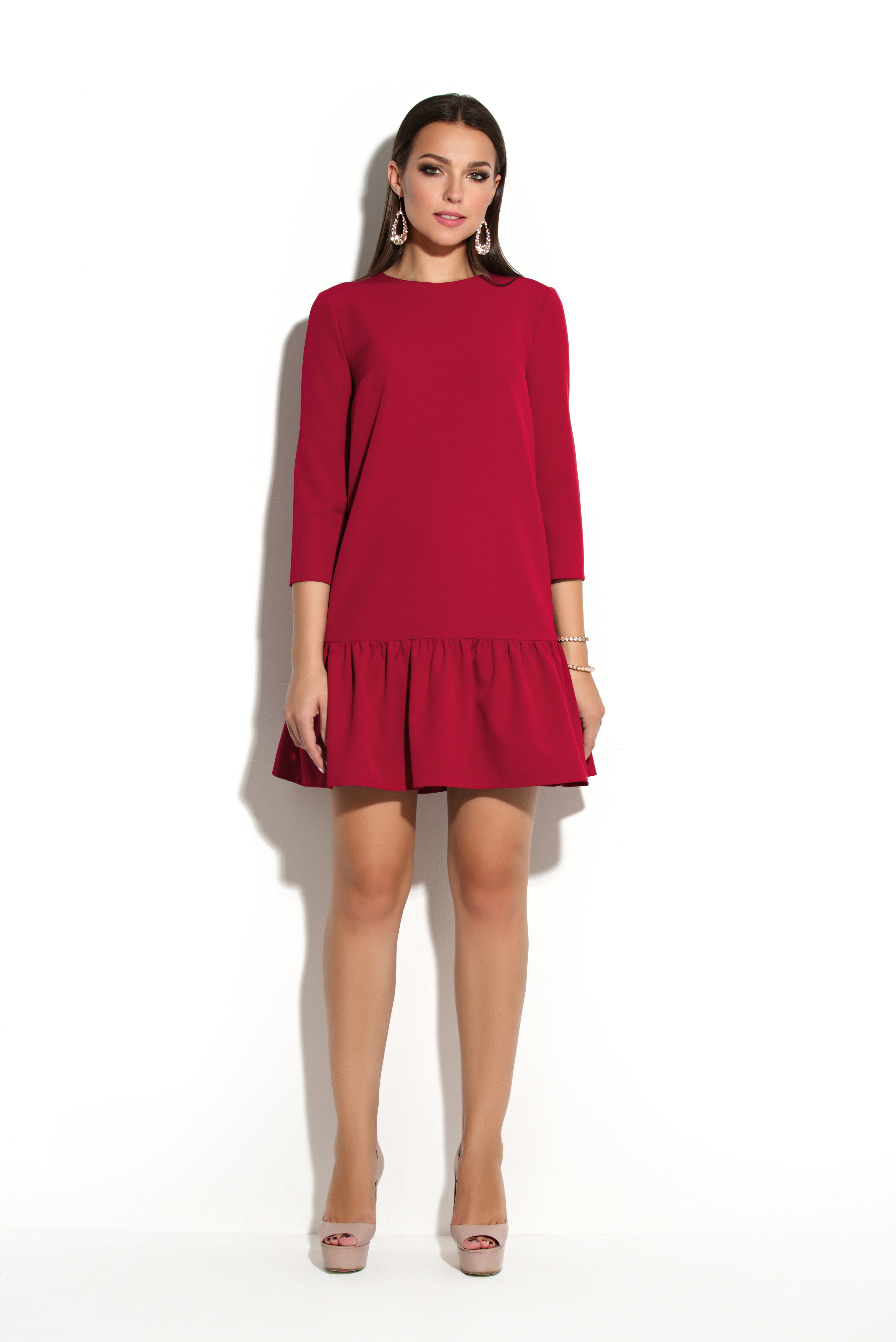 Коктейльное платье прямого силуэта с воланом по низу. Данная модель выполнена из плательной ткани с небольшим количеством эластана. В среднем шве спинке застежка на потайную молнию. Силуэт достигнут благодаря боковым швам. Вырез горловины круглый не глубокий. Рукав втачной не широкий, до линии локтя.