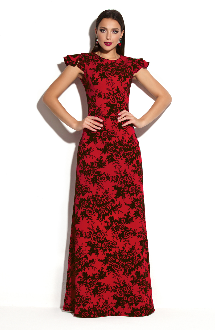 Вечернее платье длиной в пол. Данная модель выполнена из плотной трикотажной ткани . Платье отрезное по линии талии. На лифе платья введены рельефы. Юбка слегка расширена к низу, образует трапециевидный силуэт. Сзади в средний шов юбке вшит расклешенный клин. Двойные воланы вместо рукавов напоминают крылышки, этот элемент придает модели женственности и романтизма. Вырез горловины - не глубокий круглый.