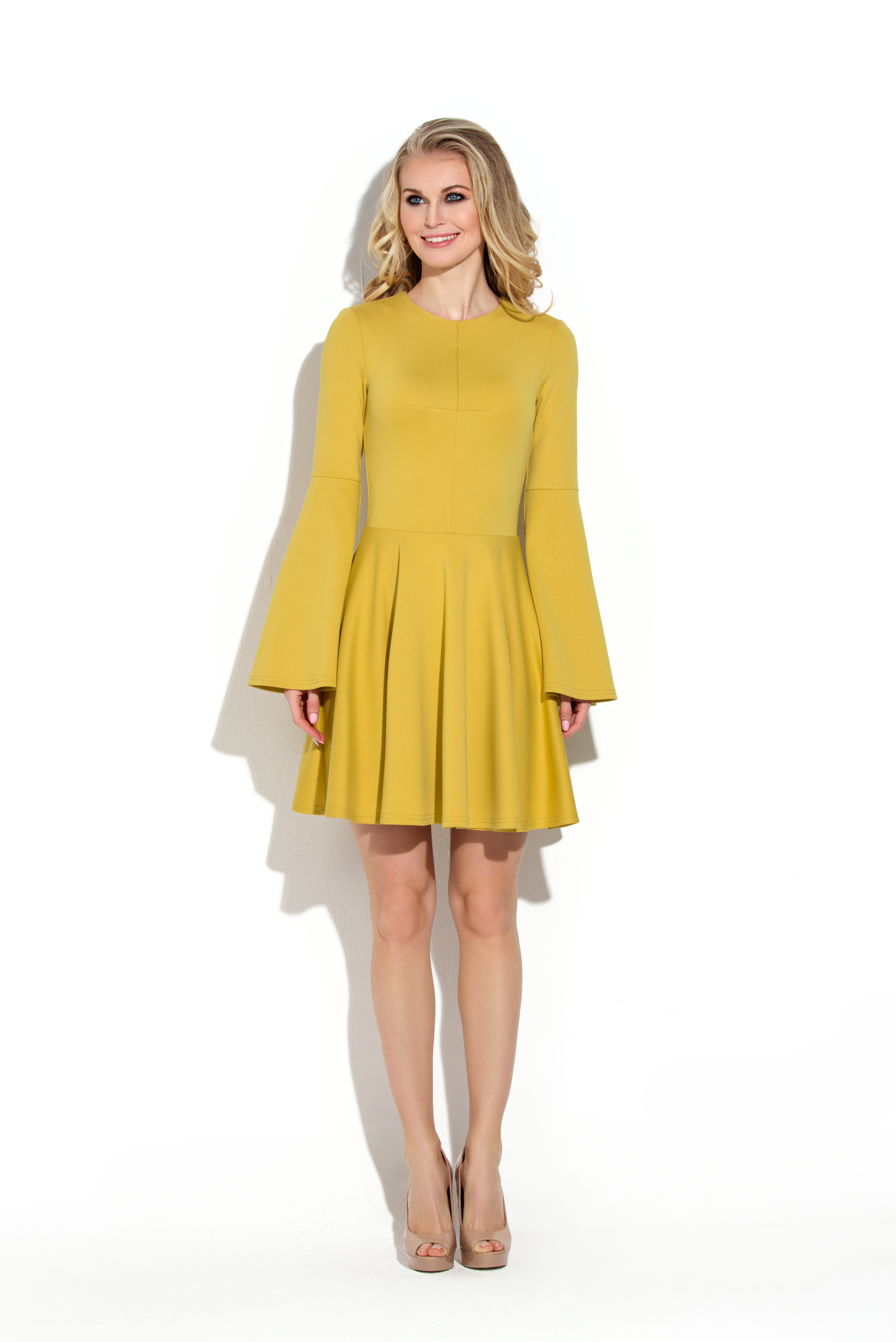 Коктейльное платье отрезное по линии талии. Силуэт лифа, достигнут благодаря нагрудным вытачкам. Полочка со средним швом. Вырез горловины круглый не глубокий. Рукав втачной, сильно расклешен к низу. На спинке в среднем шве застежка на потайную молнию. Юбка платья имеет форму полусолнце, что придает модели еще более романтичный образ. Силуэт платья придает женской фигуре изящности, визуально делая ее стройнее.