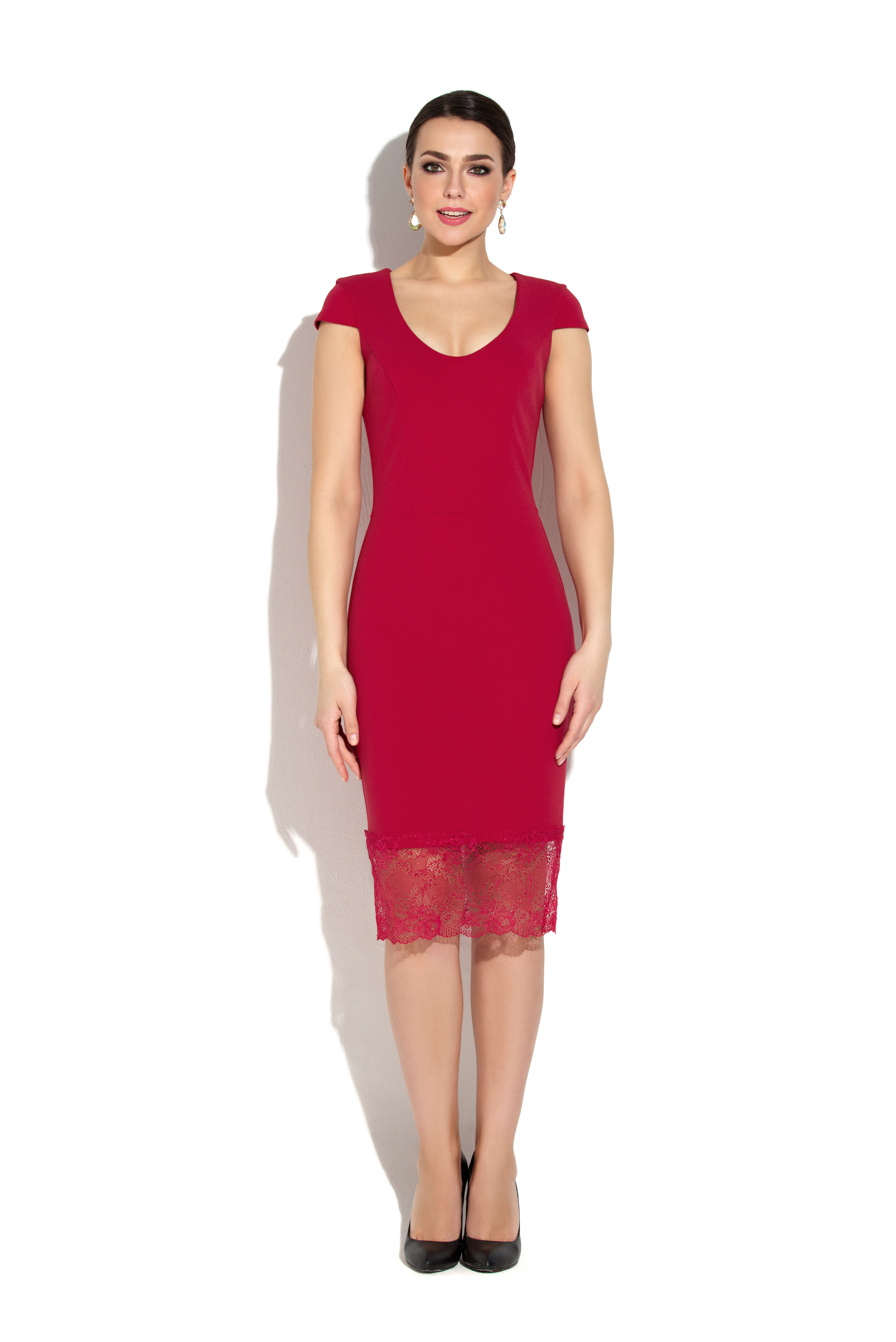 Элегантное платье футляр прилегающего силуэта выполнено из эластичного крепа. Платье отрезное по линии талии с рельефами на лифе. Спинка со средним швом, с застежкой на потайную молнию и шлицей в нем. Вырез горловины V-образный глубокий. Плечо платья слегка прикрыто коротким рукавчиком. По низу платья пришито нежное широкое кружево.