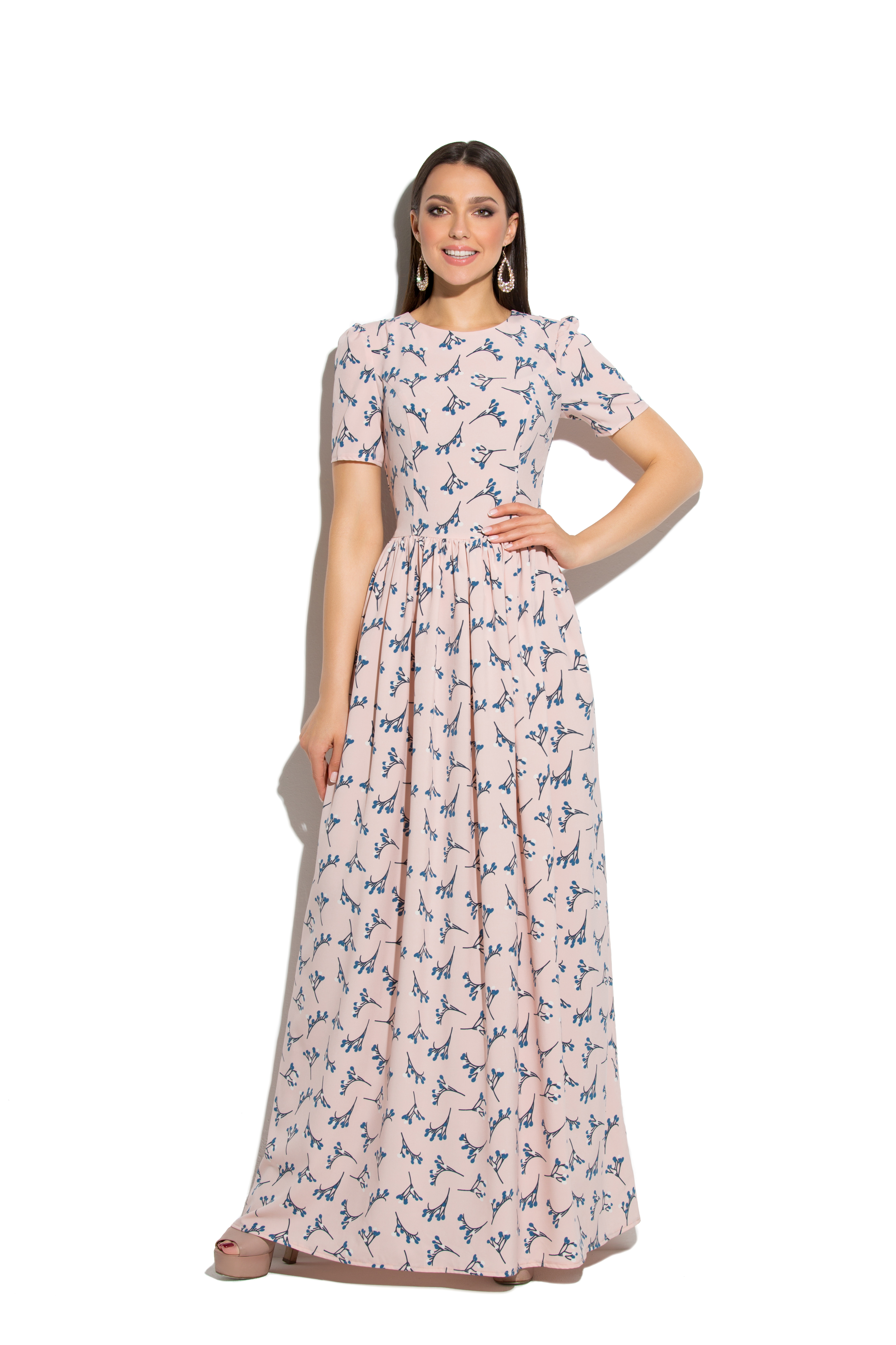Платье в пол из легкой плательной ткани. Платье отрезное по линии талии. Длинная юбка платья имеет сильное расклешение к низу, а так же сборку по линии талии. Благодаря такому крою, платье эффектно струиться при ходьбе. На спинке и полочке, для лучшей посадки изделия по фигуре, введены рельефы, в среднем шве спинки потайная молния. Вырез горловины круглы, обработан обтачкой. Рукав короткий-фонарик.