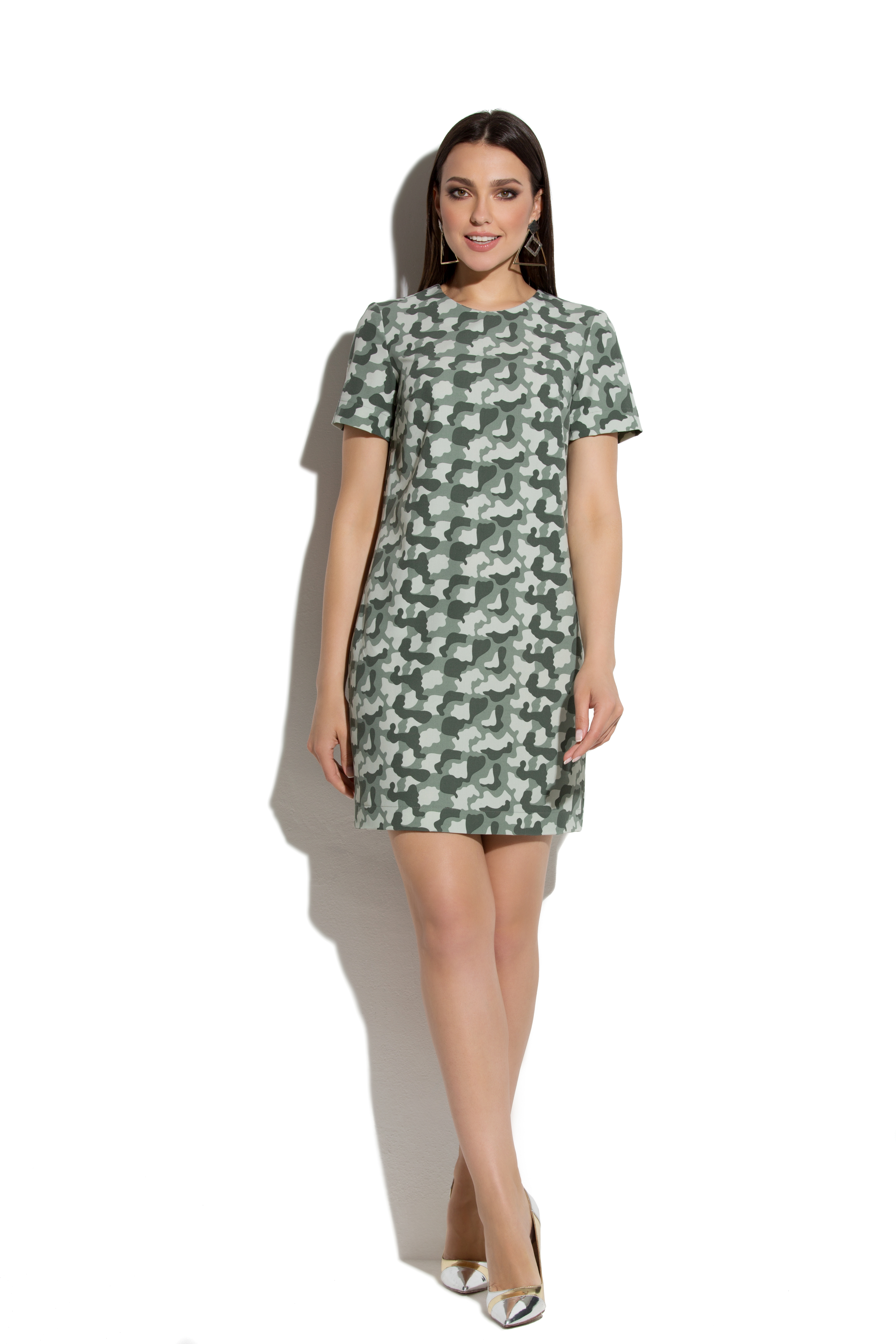 Прямое платье из хлопка с добавлением эластана. Платье простого кроя, на полочке вытачки, на спинке средний шов и талиевые вытачки. Вырез горловины круглый. Рукава короткие втачные. Прямой, свободный силуэт платья подходит обладательницам всех типов фигур, а последние несколько сезонов он еще является и модным трендом.
