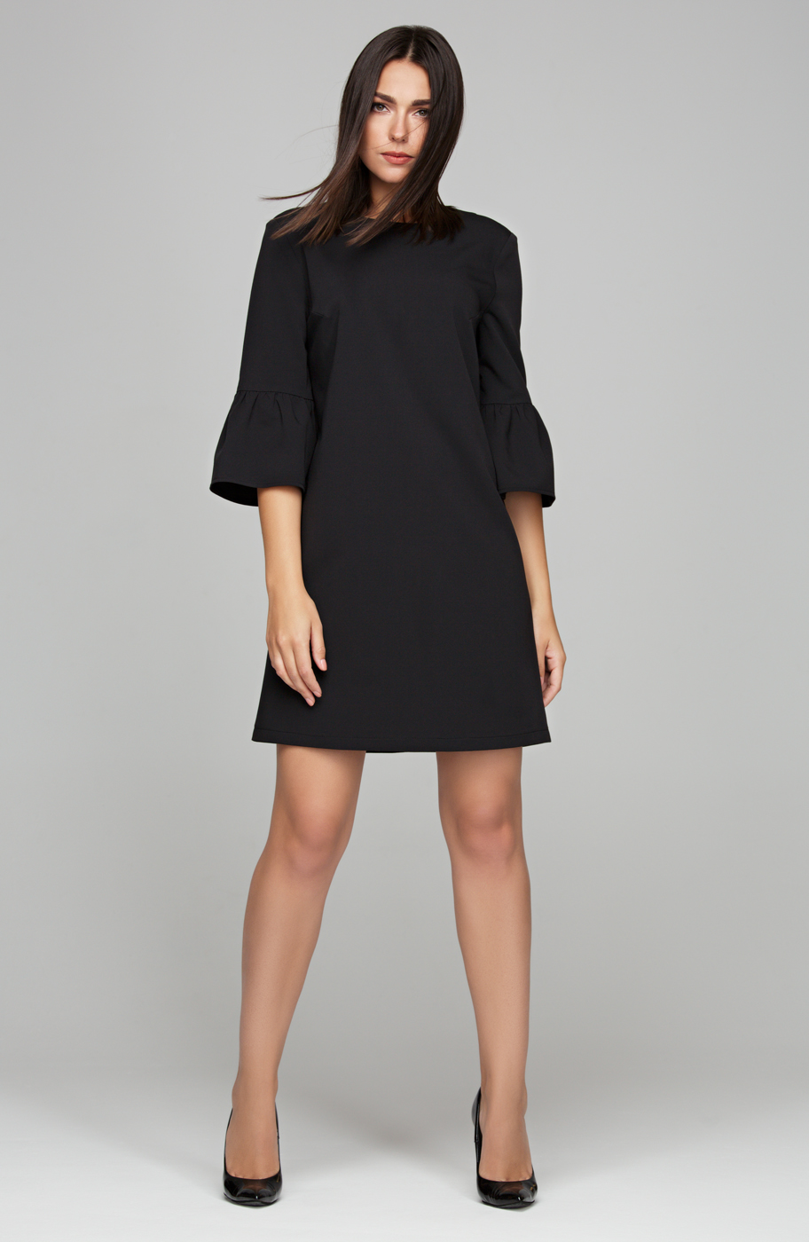 Коктейльное платье выполнено из ткани <<гальяно>>. В среднем шве спинке вырез <<капля>> и застежка на пуговицу. На полочке нагрудные вытачки. Вырез горловины круглый не глубокий. Рукав втачной длинной 3/4 , с широким воланом и сборкой