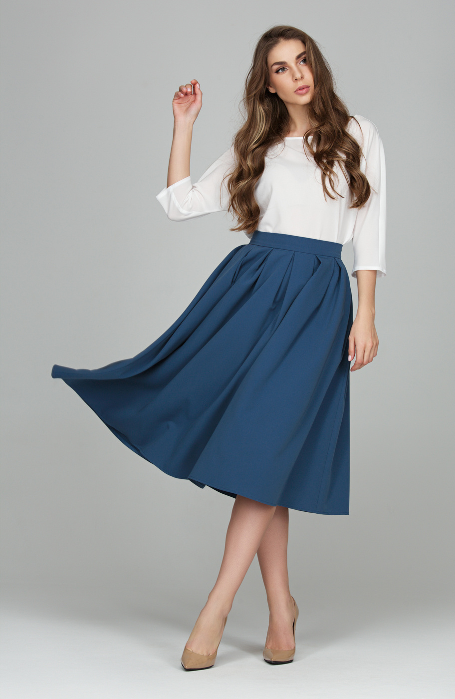 Юбка в складку длинной <<за колено>>. Юбка выполнена из ткани <<гальяно>>. Особый крой юбки с глубокими складками создает силуэт в стиле New Look, напоминающий перевернутый цветок. Верхний край обработан поясом. На заднем полотнище средний шов и застежка на потайную молнию.
