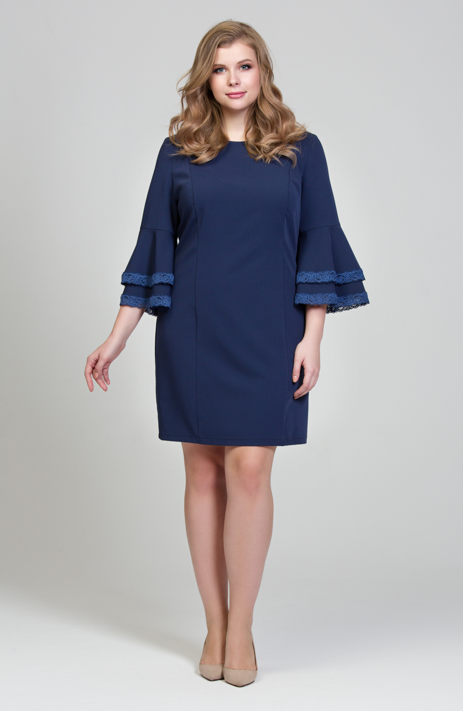 Нарядное платье из приятной костюмной ткани <<гальяно>>. Силуэт платья полуприлегающий. На спинке введены рельефы, на спинке - средний шов. Рукав длинный до локтя. Низ рукава оформлен двумя воланами, декорированными по низу кружевом. Горловина круглая не глубокая. Застежка на потайную молнию в среднем шве спинке.