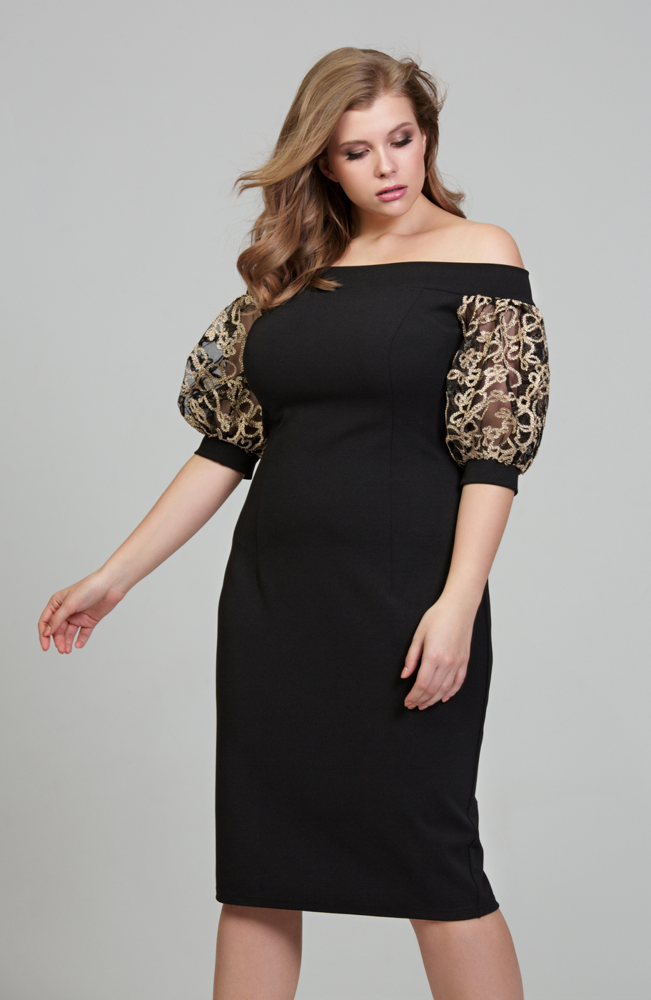 Платье-футляр из трикотажной ткани <<поликреп>>. На полочке и спинке данной модели введены рельевы. Застежка на потайную молнию в среднем шве спинке. Вырез декольте глубокий с открытыми плечами. Рукава выполнены в виде объемных <<фанариков>>, выполнены из сетки с шикарным шитьем на ней.