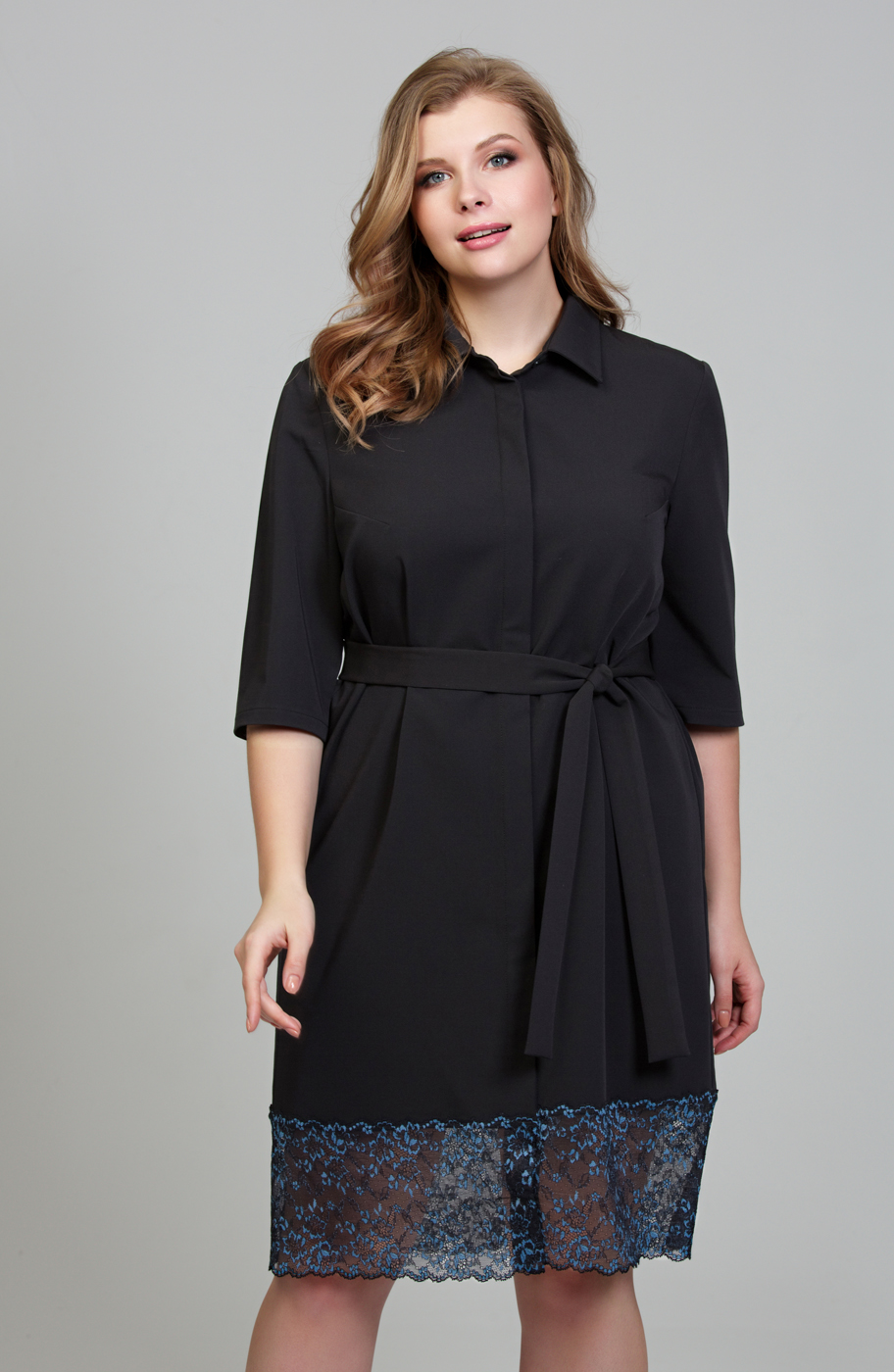 Платье-рубашка из приятной ткани <<гальяно>>. Платье прямого силуэта в комплекте с поясом. На полочке потайная застежка на пуговицы. Низ платья оформлен декоративным нежным кружевом. Воротник отложной со стойкой. На спинке кокетка и небольшая бантовая складка. Рукав втачной длинной до локтя.