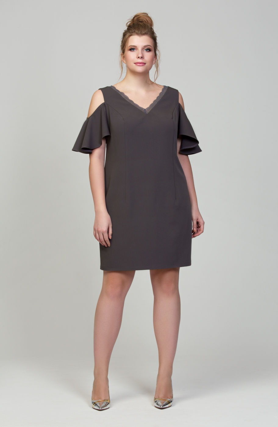 Коктейльное платье полуприлегающего силуэта из приятной плательной ткани <<гальяно>>. Вырез горловины V-образный глубокий на спинке и на полочке, декорирован кружевом. На полочке введены рельефы. Рукав платья представляет собой широко разведенный волан с открытыми плечами.