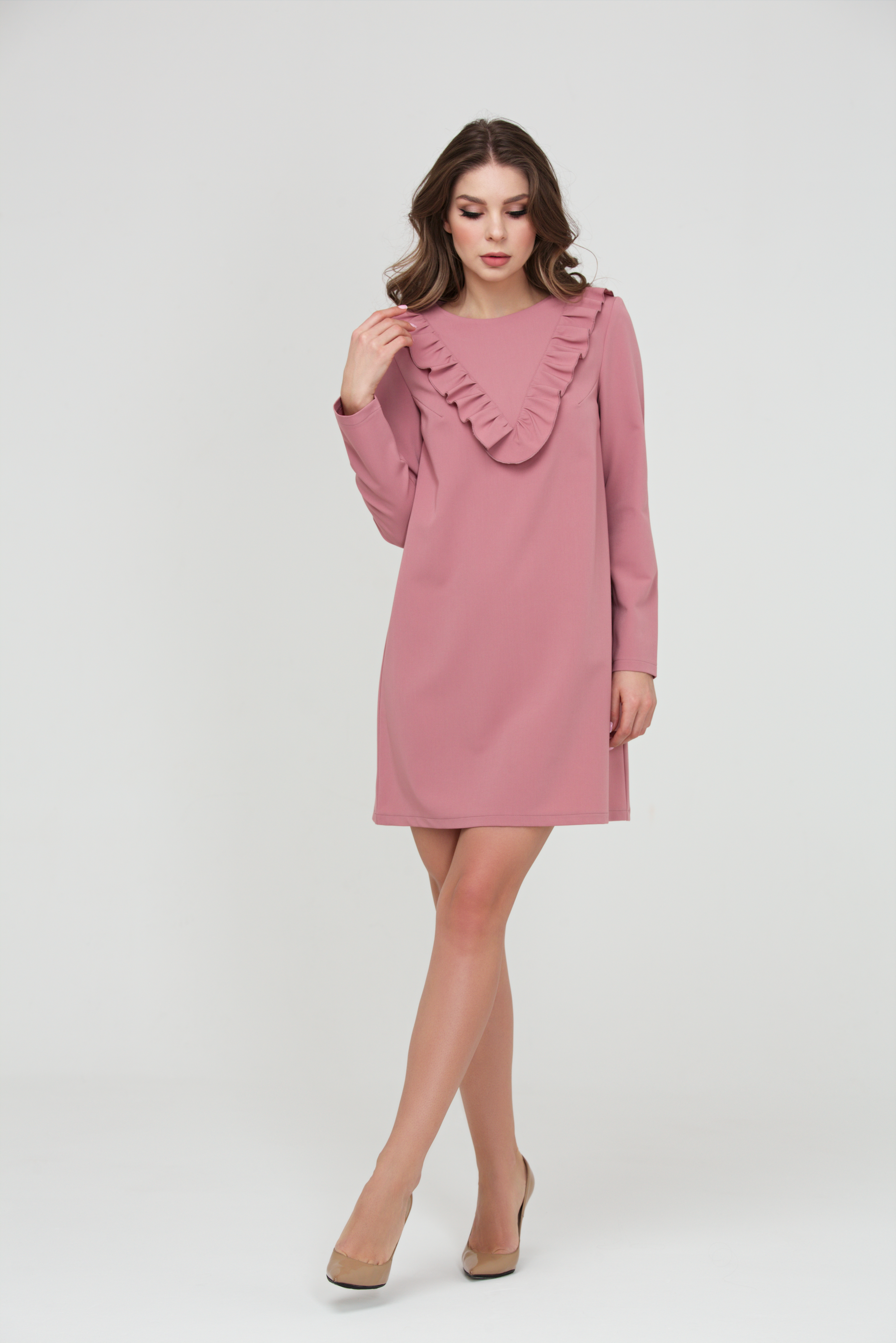 Романтичное плате полуприлегающего силуэта из плательной ткани <<гальяно>>. На полочке вверены нагрудные вытачки и декоративная рюша. Вырез горловины круглый не глубокий. В среднем шве спинки застежка на потайную молнию. Рукав втачной длинный.
