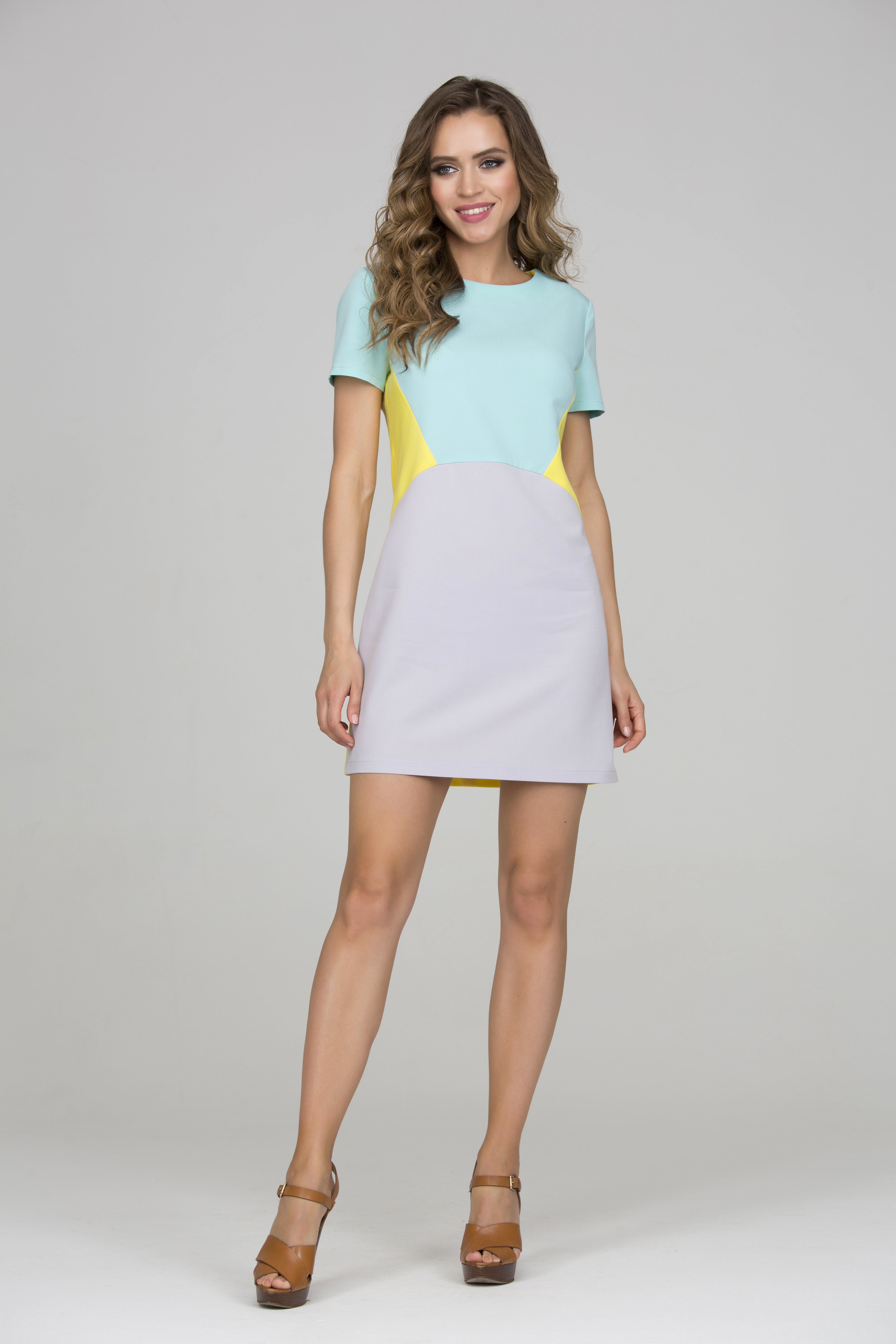 Коктейльное платье <<мини>> из приятной ткани <<гальяно>>. Платье слегка приталенного силуэта, выполнено из комбинации трех цветов ткани. Вырез горловины не глубокий круглый. Рукав втачной выше локтя. В среднем шве спинке застежка на потайную молнию.