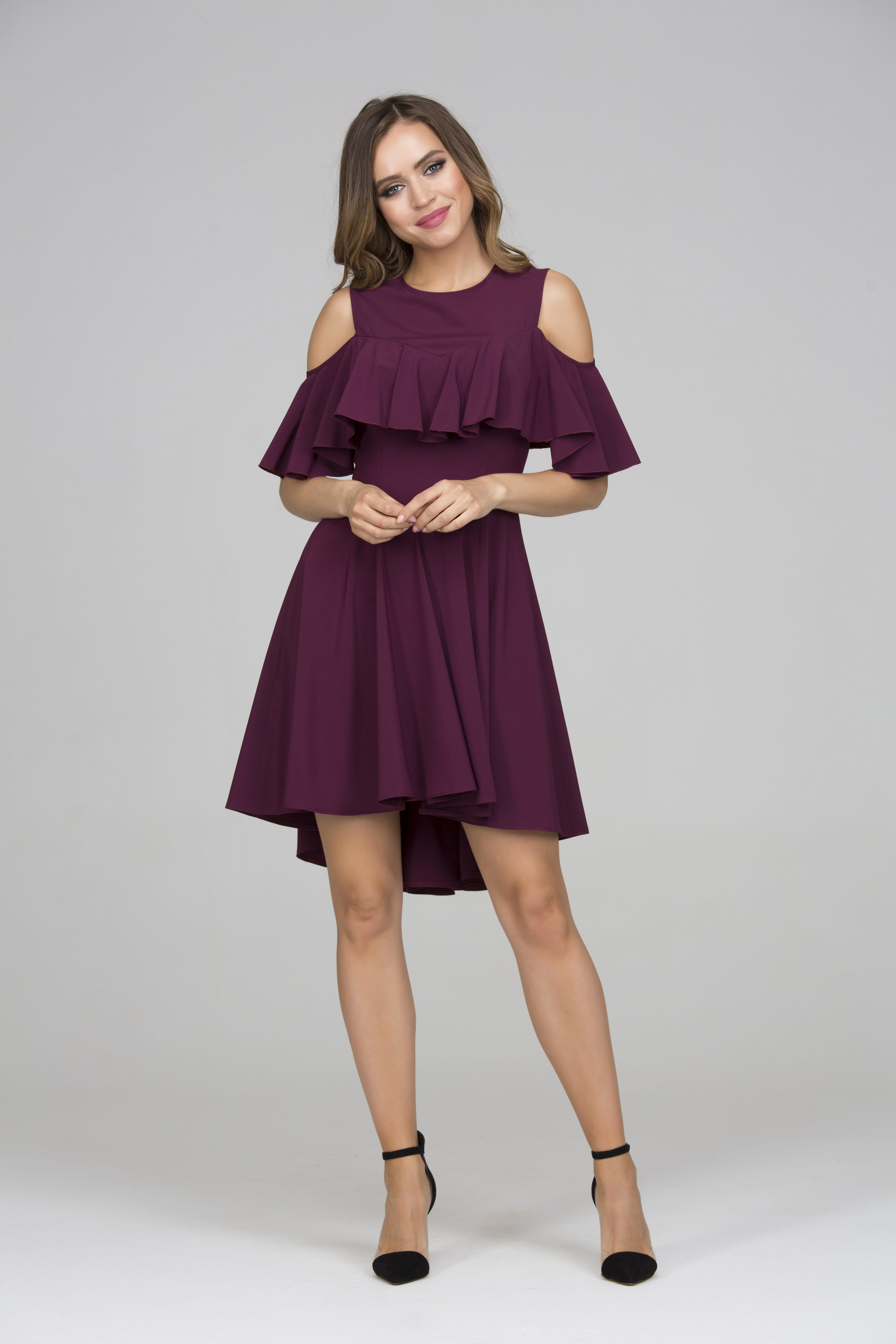 Коктейльное платье выполнено из приятной ткани <<ниагара>>. На спинке средний шов с каплей и застежкой на пуговицу и потайная молния. На лифе декоративный волан. Рукав платья представляет собой разведенный волан. Платье отрезное по линии талии. Юбка платья сильно расклешена. Длинна платья ассиметричная; спинка платья длиннее полочки.