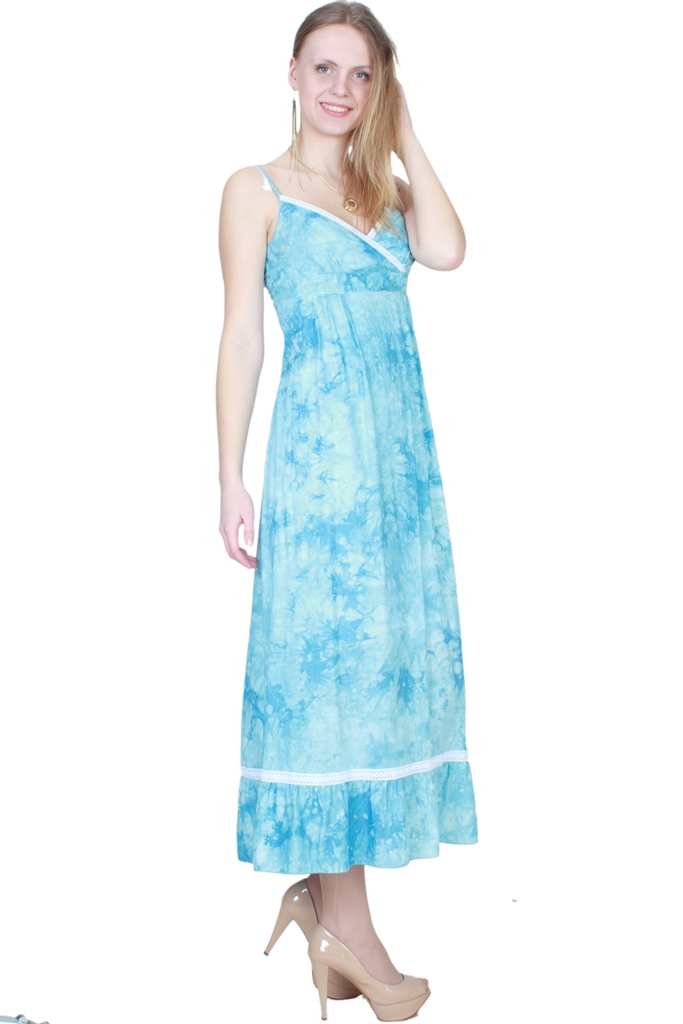 Спинка собрана на резинки, что обеспечивает плотное прилегание верхней части сарафана.