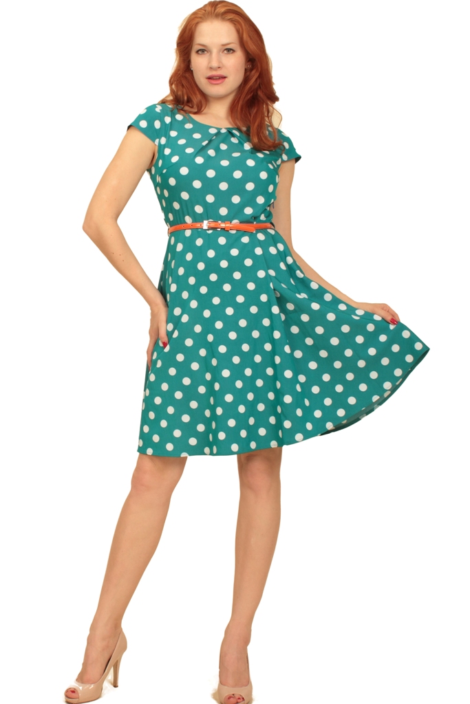 Модное платье из стрейчевой ткани в горошек и юбкой солнце.Пояс входит в комплект.