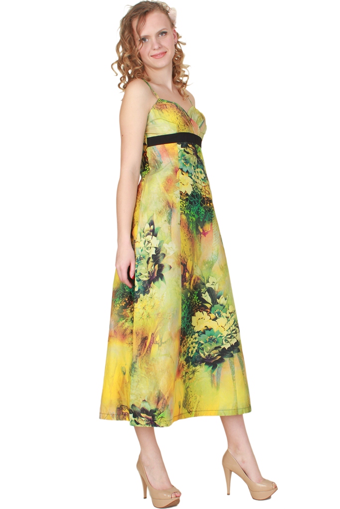 Спинка собрана на резинки, что обеспечивает плотное прилегание верхней части сарафана.
