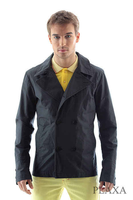 Силуэт - "slimfit", короткая, двубортная, застёжка смещённая на четыре петли и пуговицы, воротник пиджачного типа с отрезной стойкой, нижние прорезные карманы с настрочными листочками, вверхний левый карман прорезной с листочкой, внутренние прорезные горизонтальные карманы с листочками из основного материала, сзади настрочная декоративная деталь в виде хлястика с петлёй и пуговицей, соединяется с воротником при помощи пластиковой пряжки, без утеплителя.